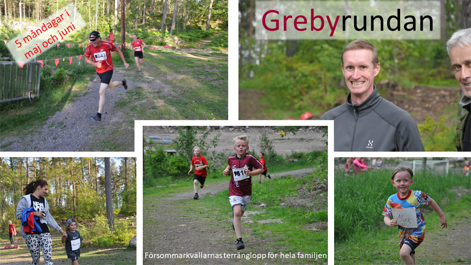 Äntligen är det dags för Grebyrundan igen med start måndag den 7 juni och därefter ytterligare de fyra följande måndagarna. På grund av Coranasituationen har vi arrangörer valt att likt förra året genomföra årets Grebyrunda som en tävlingsserie med ett annat upplägg än tidigare år - det blir ingen gemensam start utan valfri starttid mellan kl 17.30-19.00 i samtliga klasser. Annorlunda, ja, men det öppnar också upp för nya möjligheter. Att först springa tillsammans med sitt barn för att sen ge sig ut själv och jaga ifatt den som startade strax före - eller hålla undan för den som startade bakom. Att utmana klockan, kroppen och knoppen istället för ryggen framför. Springer du snabbare eller långsammare när du själv sätter tempot? Läs mer om tävlingen på Grebyrundans hemsida. Väldigt viktigt! - Anmäl dig själv via anmälningslänk på Grebyrundans hemsida, se länk ovan, innan tävling, helst redan nu och absolut innan du kommer fram till startfunktionär - Ta nummerlapp vid nummerlappsbordet enligt det nummer du blivit tilldelad, se startlista på Grebyrundans hemsida (uppmärksamma tävlingssekretariatet om du inte fått någon tilldelad nummerlapp än) - Behåll nummerlappen och använd samma nummerlapp vid resterande deltävlingar - Inga stora samlingar av tävlande eller medföljare vid start, mål eller sekretariat, utan gå till start när du är uppvärmd och redo samt stanna inte kvar vid mål efter målgång. - Medföljande följer och hejar förslagsvis ute längs spåret - Följ de rekommendationer som folkhälsomyndigheten ger om att hålla avstånd till varandra; - Du ska självklart inte tävla eller vara på plats om du känner några symptom - Använt sunt förnuft och tänk på varandra Varmt välkomna till en, flera eller alla Grebyrundor 2021!