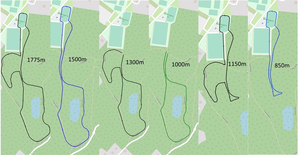 Denna vecka blir det lite längre intervaller. Egen uppvärmning kl 18. Start intervaller kl18.15 vid Grebyrundanstarten. För att hålla ihop vilan så finns det 6 alternativ. Målet är att vila tillsammans samtidigt i 2 minuter mellan intervallerna. Se bilden för alternativ, allt från 850m till 1775m. 6 stycken intervaller är målet.