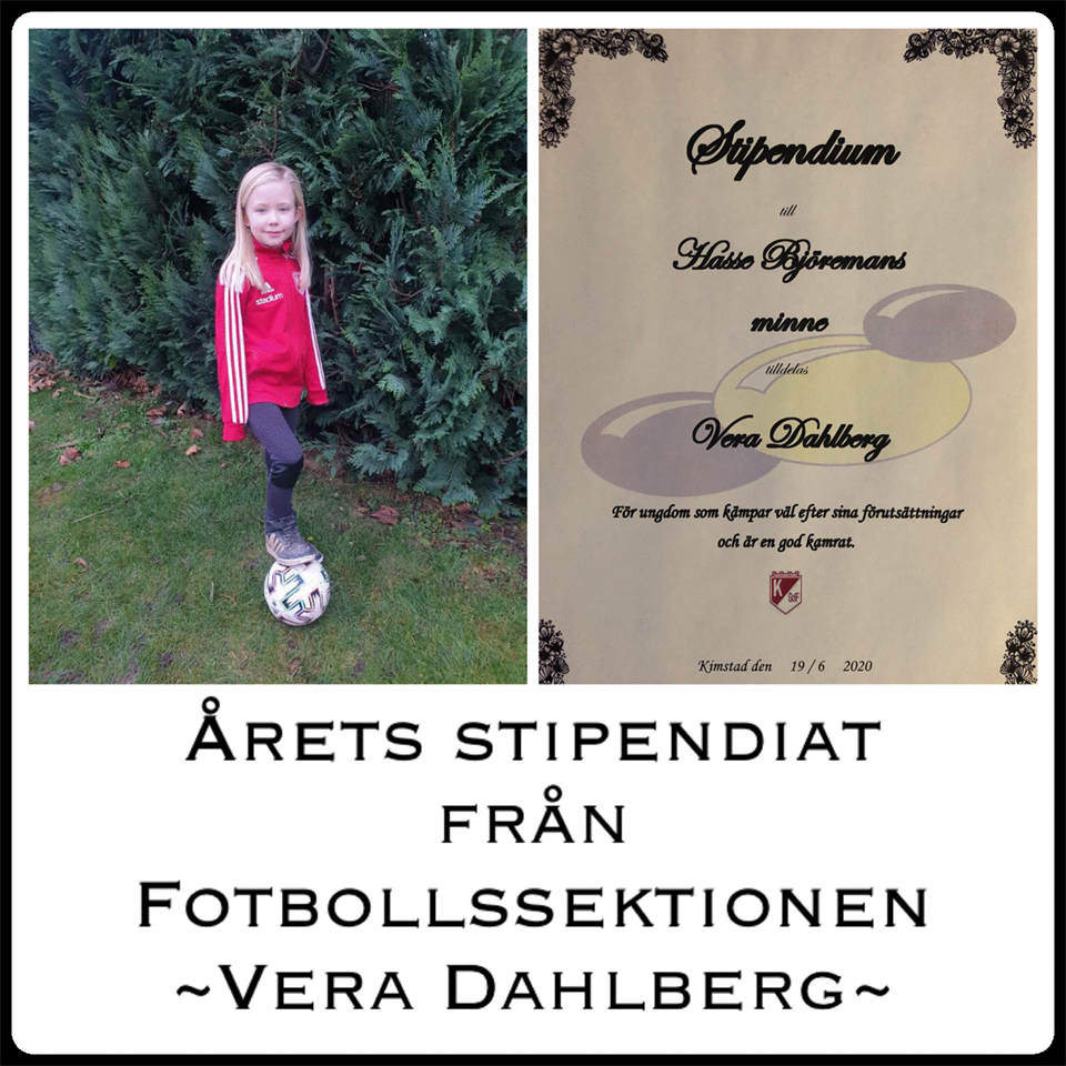 Hasse Björemans minnesfond delar sedan 2017 ut stipendie till två ungdomar varje år, en från Skidsektionen och en från Fotbollssektionen med kriteriet En ungdom som kämpar väl efter sina förutsättningar och är en god kamrat. Stipendieutdelning brukar göras vid Midsommarfirandet i Krokhagen, men detta speciella år delas stipendierna ut vid två separata tillfällen. Utdelningen har under hösten blivit framflyttad pga restriktioner och sjukdom. Men idag lyckades vi äntligen få dela ut priset. Årets stipendiat från Fotbollssektionen som ärades Hasse Björemans minne blev Vera Dahlberg med följande motivering: Vera har spelat fotboll i Kimstad sedan hon var fyra år. Det senaste året har hon utvecklat väldigt mycket som spelare. Vera är alltid glad och positiv på match och träning. Hon är en omtänksam lagkamrat som alltid gör sitt bästa och kämpar oavsett situation. Stort grattis Vera önskar Helena Björeman, Fotbollssektionen och framförallt Hasse, som säkerligen stolt är med dig och oss allesammans. Skidsektionens stipendiat till Hasse Björemans Minne har tidigare annonserats och det blev Agnes Eklund.