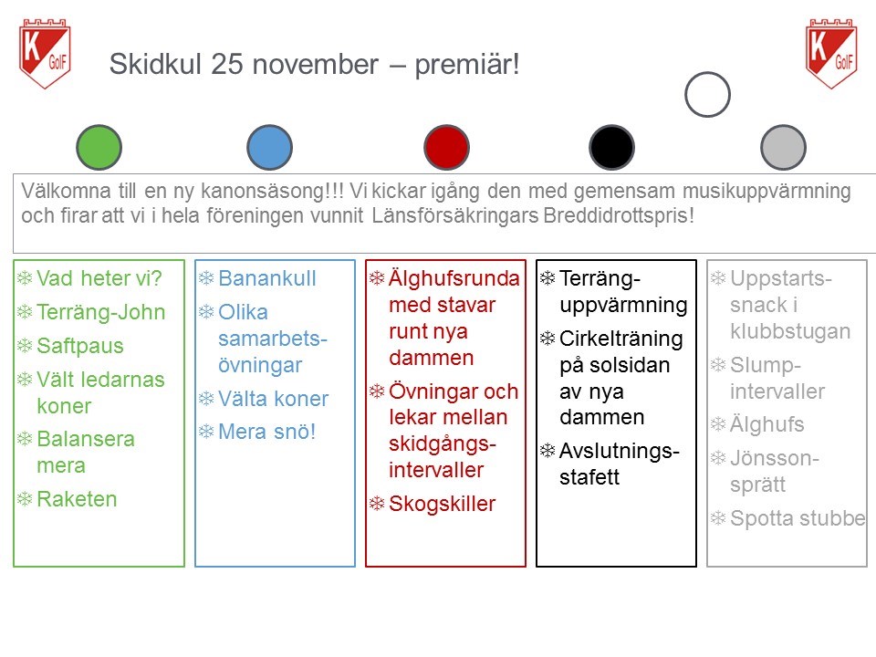 Äntligen kör vi igång! Skidkul anno 2018 har potentialen att bli den bästa Skidkulssäsongen hittills, var med från början! Nu är det Skidkul varje lördag ända tills den 17 mars, oavsett om det är barmark eller snö! Det fär bara att dyka upp en lördag som passar, ingen föranmälan krävs. Det finns en hel del låneutrustning för både barmark och vinter så att alla kan prova på och se hur roligt det är med Skidkul. Veckans aktuella innehåll kommer att läggas upp här på Skidkuls hemsida och Skidkuls facebooksida. Mer info om Skidkul finns här. Gruppindelningen i år är i princip som förra året, se nedan, men det viktigaste är att nivån är motiverande och inspirerande och då kan man både gå uppåt och nedåt en nivå för att hitta rätt. Grön födelsår ca 2013-2015 Blå 2011-2012 Röd 2009-2010 Svart 2007-2008 Silver ca 2000 - 2006 Varmt välkomna!
