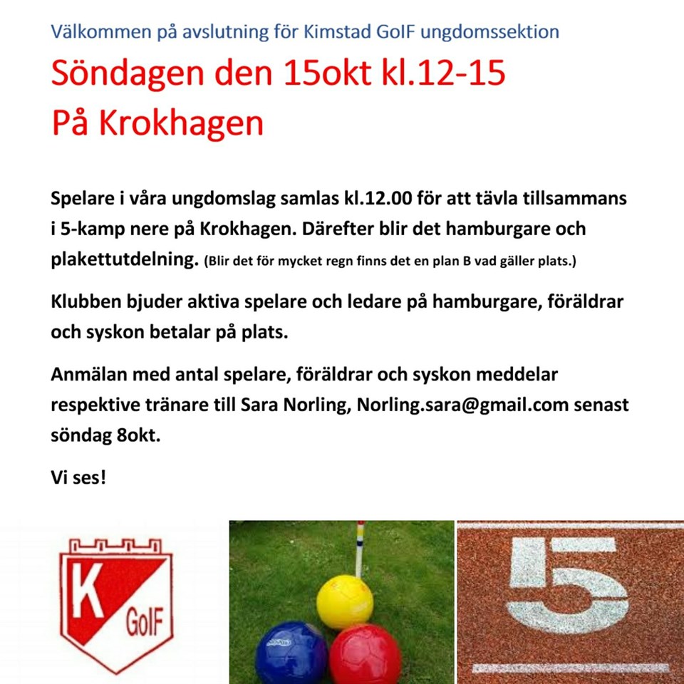 Hej! Tack för denna säsong, nu tar vi ett litet uppehåll, innan vi börjar inomhus. Hur länge vi har uppehåll är ej bestämt ännu, så håll utkik här på hemsidan och eran mail angående detta, det som är klart är att vi kommer köra måndagar kl 17-18 i Skärblacka Sporthall och onsdagar kl 18-19 i Grebyskolans gympasal! Glöm ej att svara på mailet angående ungdomsavslutningen på Krokhagen sön 15/10 kl 12-15! Mvh Ledarna