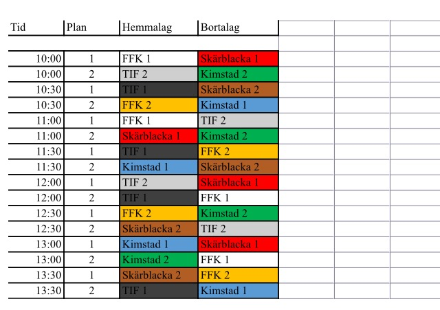 Skickar här spelschemat för lördag! Glöm ej röda fotbollstrumpor, benskydd och vattenflaska! Lättare matsäck är bra att ha med oxå! Mvh Andreas, Niklas och Johan