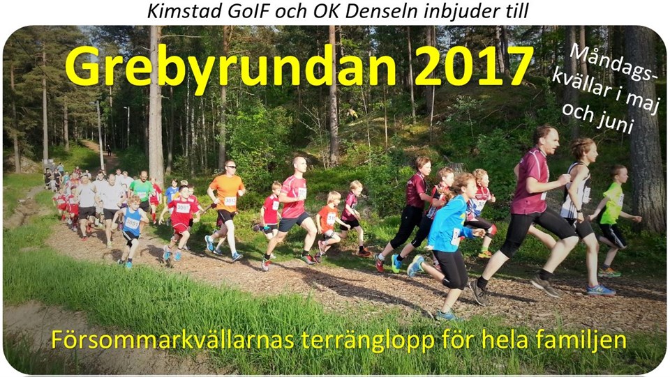 Från måndagen den 15 maj är Grebyrundan igång igen! Tävlingen för alla åldrar, från minsta knatte till äldsta pensionär, och för alla farter från motion till elit. När: 5 måndagar under maj/juni: 15/5, 22/5, 29/5, 12/6 och 19/6, knattekort och knattelång startar 18.10 och övriga klasser startar gemensamt kl 18.30. Var: Banan springs på Kimstad GoIF:s elljusspår med start och mål vid Krokhagens Idrottsplats Anmälan: På plats, senast kl 18.00 (kom i god tid, det kan bli köer speciellt när klockan närmar sig kl 18) Avgift: 20 kr i Knatteklasser och PF10, 30 kr i övriga klasser, ingen avgift för klubbmedlemmar i Kimstad GoIF och OK Denseln. Avgift betalas kontant, swish 1234522033 (märk Grebyrunda och namn) alternativt faktureras klubbar i efterhand Priser: Vid 4 genomförda lopp (då första Grebyrundan krockar med Vårruset får tjejer/damer räkna in eventuellt Vårrusdeltagande som en Grebyrunda) Se mer info om klasser och banlängder i inbjudan Se tidigare resultat på sidan för Grebyrundan Varmt välkomna!